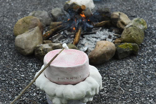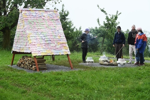 Mit ihren „performativen Installationen“ beziehen Mickry 3 das Publikum auf spielerische Art und Weise ein, und lassen dieses Teil der Installation und somit des Werkes werden. Dies ist auch bei der gezeigten Installation „meltingpoint“ der Fall. Die Künstlerinnen laden zum Grillen von Marshmallows mit Blick auf die Autobahn ein. Auf diese Weise packen MICKRY 3 das Ausstellungsthema „Halt“ beim Schopf und betrachten es von der gemütlichen Seite. Als Kontrapunkt zu Cervelats und den „Schweizer Familie Feuerstelle“ bieten sie uns eine absurde, aber gemütliche Situation an welche zum Verweilen einlädt.
