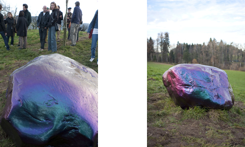 Ihr geheimnisvoller „Findling (Vanity N0.1)“ wiegt drei Tonnen und stammt aus dem Urner Reusstal. Er wurde versiegelt mit zwanzig Schichten Karosserielack. Der von den Künstlern verwendete Lack ist ein hochmodernes und sündteures Pigmentgemisch, das gewöhnlich getunte Boliden ins rechte Licht rückt: Je nach Lichteinfall und Standort des Bewunderers oszilliert die Farbe von knalligem Violett bis zu sattem Grün.